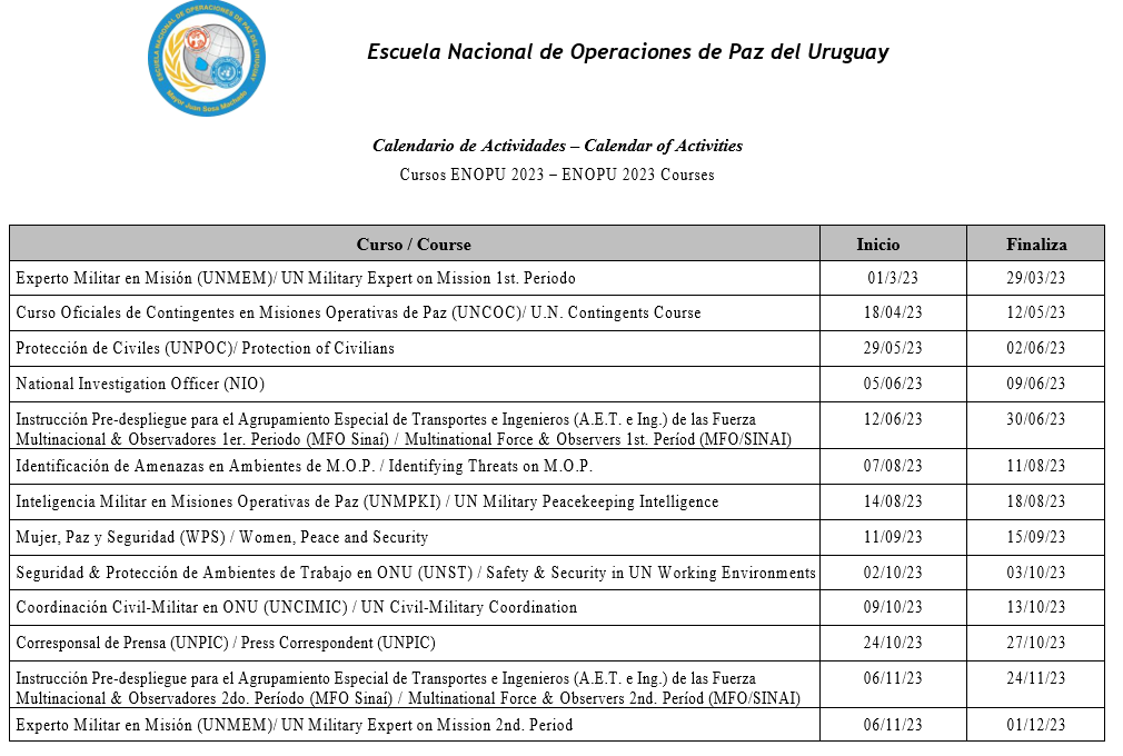 La ENOPU brinda cursos pre-despliegue recomendada por la ONU para personal que prestará servicios en Misiones de Paz, además de capacitar en roles de liderazgo y en otros roles especificos dentro de una misión. La escuela también imparte cursos funcionales a través de un cuerpo de instructores con experiencia en el terreno, de acuerdo con las normativas y materiales de capacitación que establecen las propias Naciones Unidas.