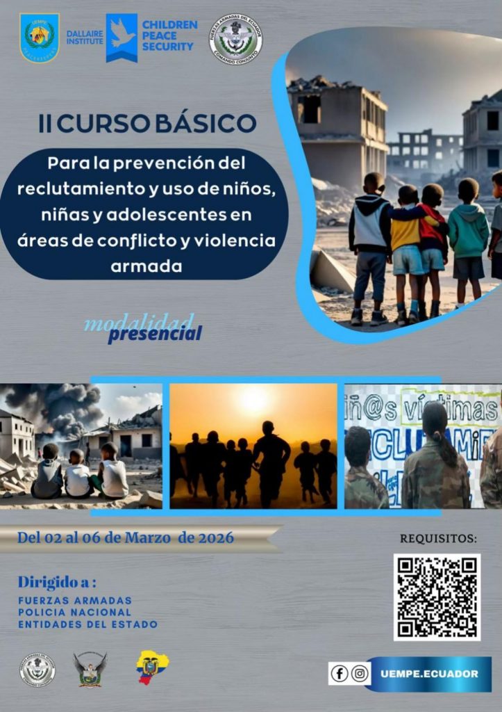 En línea con los compromisos internacionales asumidos para la protección de los derechos de la niñez en contextos de conflicto armado, se llevó a cabo en Quito, Ecuador, del 02 al 06 de Marzo de 2026, el Segundo “Curso Básico para Actores de Seguridad en la Prevención del Reclutamiento de Niños, Niñas y Adolescentes en Áreas de Conflicto”, dirigido a integrantes de las Fuerzas de Seguridad Pública del país.
